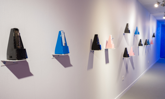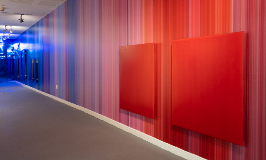 Panels painted in shades of red and blue hang along the wall. They were painted with a special paint sensitive to heat, which disappears in contact with the skin. Try touching the panels and see how your body heat affects the paint.